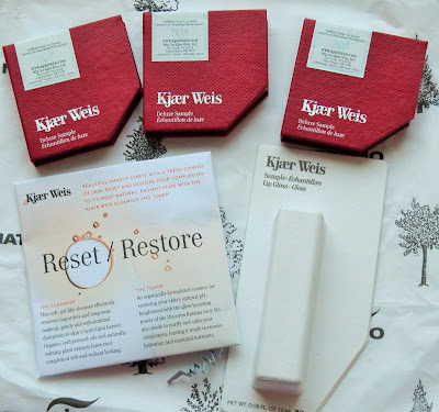 I couldn't resist The Fall Reset Kit from Kjaer Weis which I picked up at Naturisimo (£28) which contains 6 travel/try me sizes. The kit comes in a roomy reusable branded bag which will be useful for holidays or storing samples.